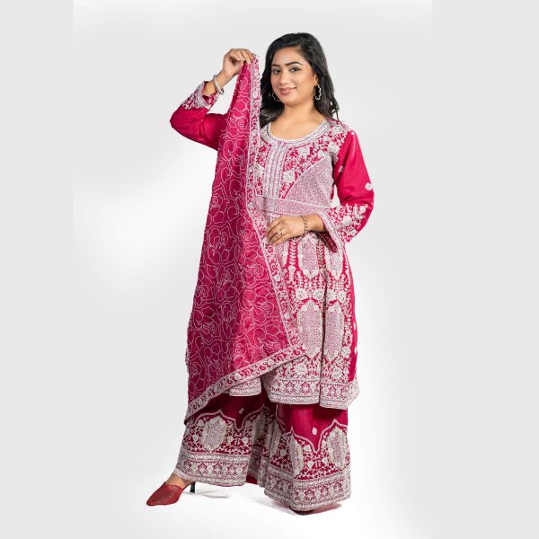 Elevate your festive and formal wardrobe with this beautifully crafted 3-piece traditional set. Designed with intricate golden embroidery and delicate stone work, this outfit blends classic elegance with modern comfort—ideal for weddings, celebrations, and cultural occasions.